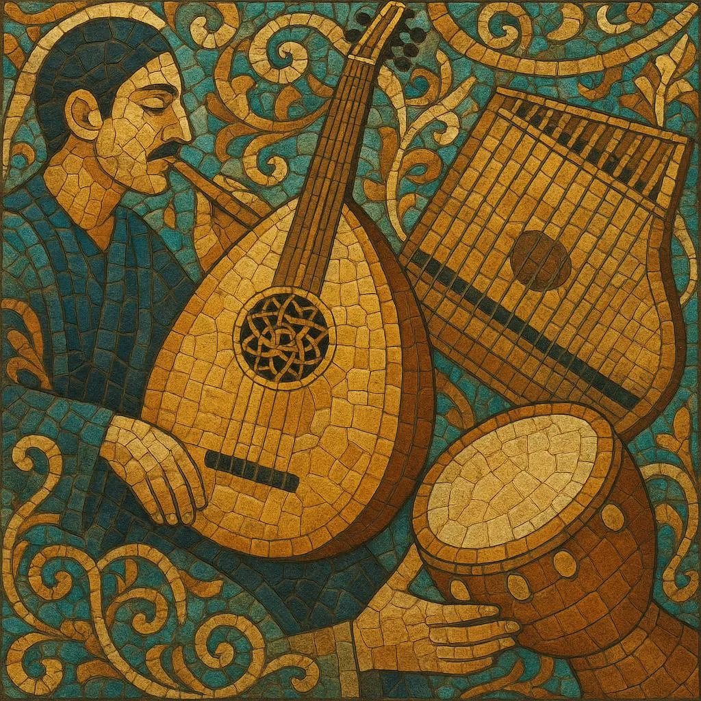 It centers on solo improvisations (taqsīm), chamber small-ensemble (takht) pieces, and composed instrumental forms such as samāʿī, bashraf, longa, dulāb, and tahmīla. Typical instruments include the oud (fretless lute), qanun (zither), nay (end-blown flute), violin adapted to Arabic intonation, riqq and darbuka (frame and goblet drums), along with bass and regional lutes (buzuq). While deeply rooted in 19th‑century Cairene, Syrian, Iraqi, and Ottoman-Arab court and urban music, the style has evolved to include orchestral film scores and modern jazz/electronic fusions—always retaining its maqām-based melodic grammar and heterophonic ensemble texture.