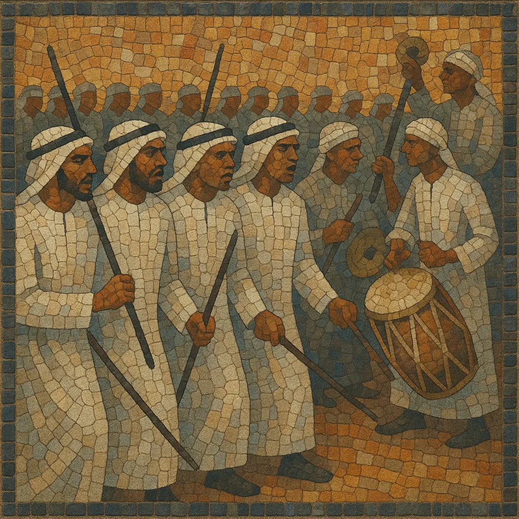 The performance is led by a chant leader and supported by a battery of frame and barrel drums, with brass cymbals punctuating the beat. Poetry praising community, kinship, valour, hospitality, and leaders is central, making Ayyalah both a musical and social ritual that affirms solidarity. Its rhythm is martial and processional, yet celebratory, and its melodies draw on Arab modal sensibilities while remaining simple and strongly rhythmic.