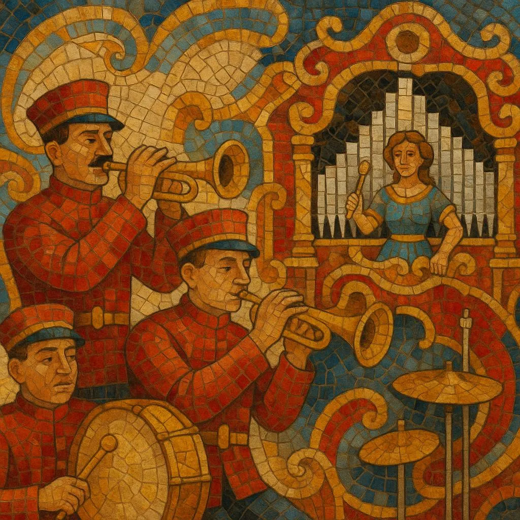 Between the 1900s and the First World War, the band organ became the sound of the midway. Instruments grew in scale and theatricality, sporting animated facades and trumpets “en chamade.” Repertoires favored marches (Sousa and contemporaries), waltzes, polkas, cakewalks, and the latest salon and operetta hits—arranged specifically for the pneumatic logic and limited note channels of the organs.