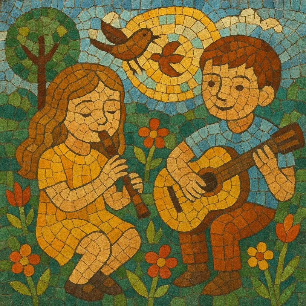 Musically, the style favors diatonic melodies in major keys, narrow vocal ranges, and steady dance‑like meters (2/4, 3/4, or light 4/4). Arrangements commonly feature piano, acoustic guitar, light percussion (including Orff instruments), recorders or flutes, and small choirs. Call‑and‑response, repeated refrains, and onomatopoeia support participation and learning.