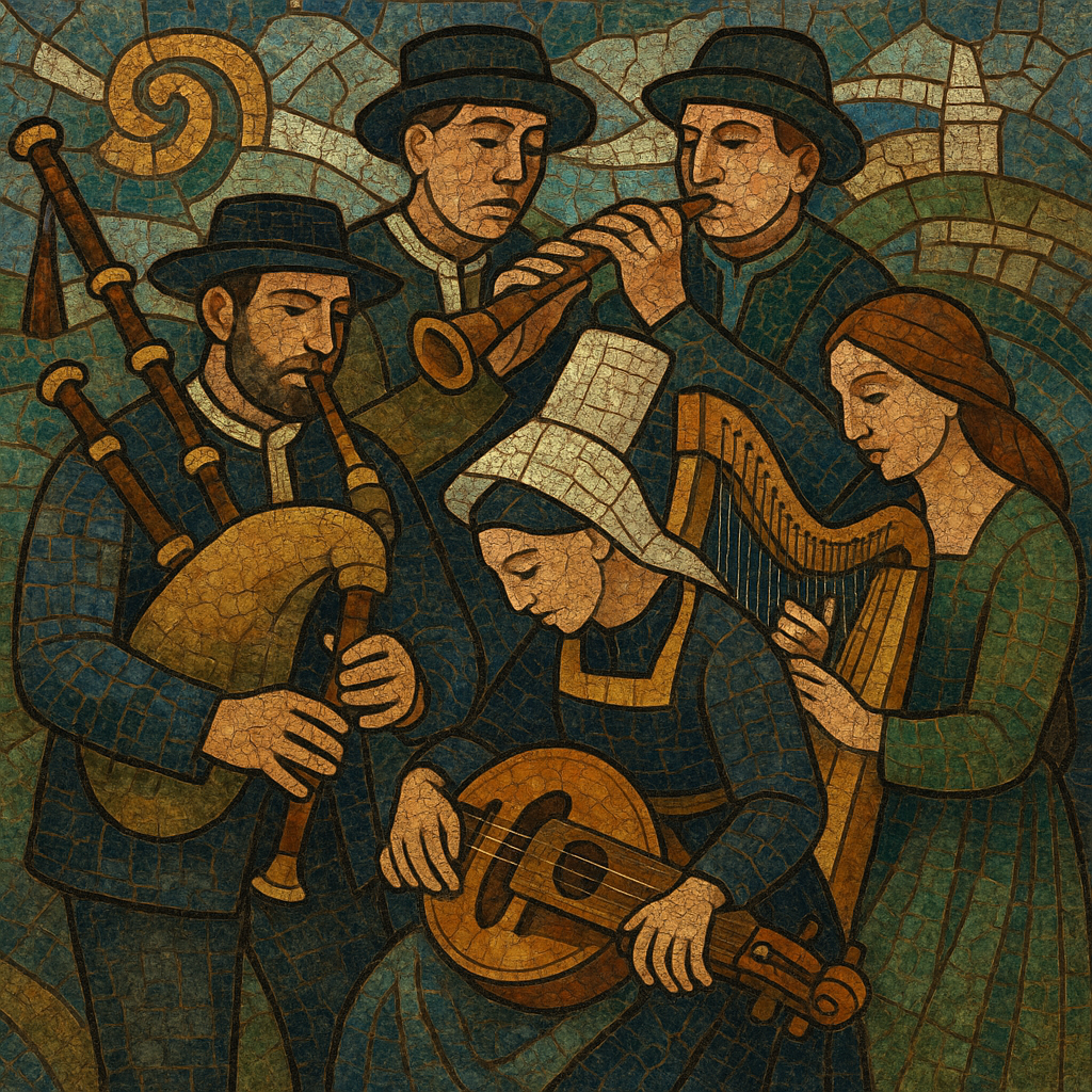 Signature elements include call‑and‑response singing such as kan ha diskan for dance, modal melodies (often Dorian, Aeolian, or Mixolydian), and sustained drones. Core instruments are the bombarde (a double‑reed shawm) and the biniou (Breton bagpipe), alongside veuze, diatonic accordion, fiddle, Celtic harp, and hurdy‑gurdy. The music’s dance‑driven forms (gavotte, an dro, hanter‑dro, plinn, ridée, etc.) use distinct step cycles and phrasing that shape melodic and rhythmic contour. Modern scenes also feature bagadoù (pipe‑and‑drum bands) and fusions with folk‑rock and contemporary Celtic styles.