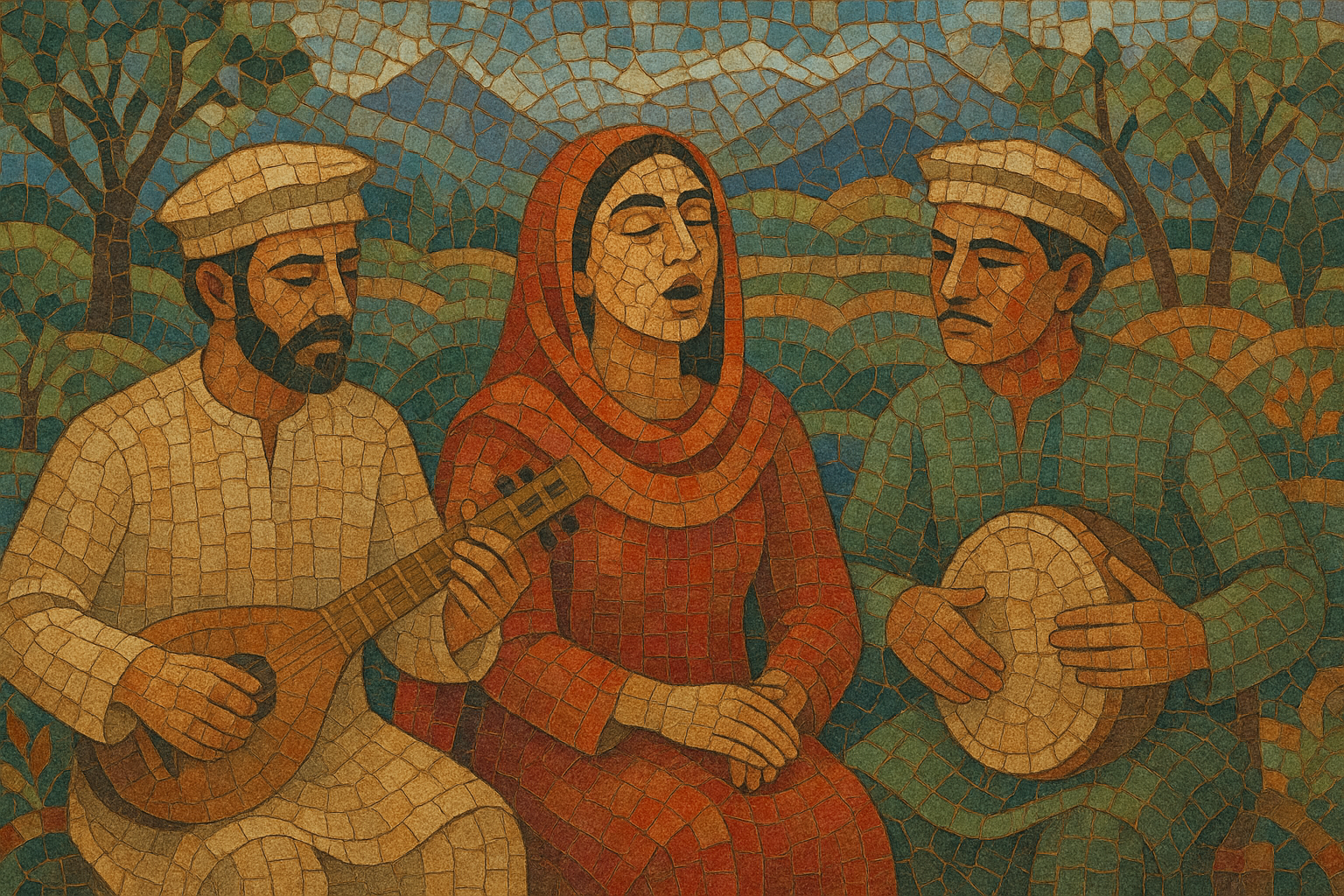 Musically, it favors modal melodies carried by solo voice or small choruses over a sustained drone, supported by earthy percussion and piercing ceremonial winds. Common instruments include the rubab (lute), dhol/daman (double-headed drum), daf (frame drum), surnai (shawm), bamboo flutes (e.g., bansuri), and the jaw harp (chang). Texts are in Burushaski, with poetic images of mountains, rivers, orchards, and kinship ties, and with devotional poetry reflecting the region’s Islamic (predominantly Ismaili) heritage.