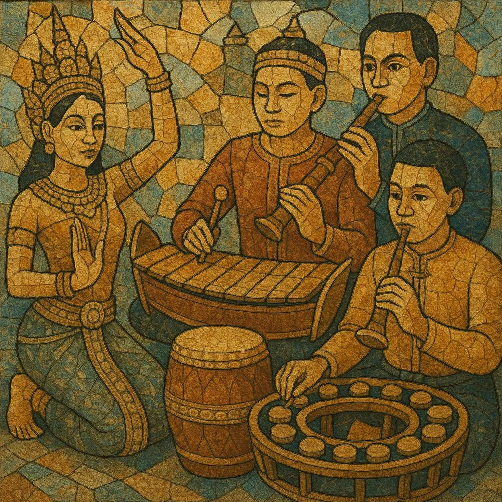 The sound world is heterophonic: multiple instruments elaborate the same melody at different densities and registers. Core timbres include roneat (xylophones), kong vong (gong-circles), the nasal sralai oboe, sampho and skor thom drums, and chhing finger cymbals marking the time cycle. In lighter contexts, bowed tro fiddles, khim hammered dulcimer, and zither join (mohori). Modal pitch systems are non–equal-tempered and ornamented, yielding floating, radiant sonorities that support royal dance, mask theater (lakhon khol), and temple ceremonies.