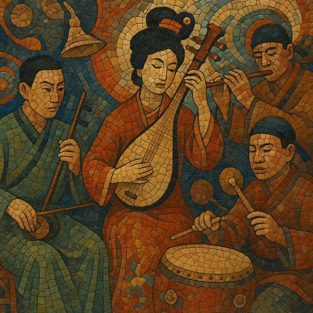 Keep harmony implicit; emphasize parallel ornamental lines and drones rather than Western chordal progressions. The yangqin and plucked lutes supply rhythmic-harmonic scaffolding through broken-tone patterns that outline the mode.