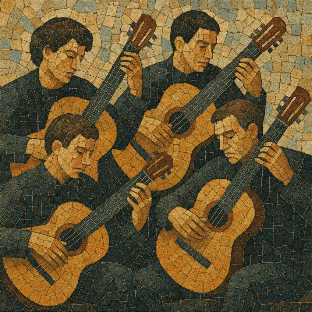 Classical guitar quartet is a chamber-music format scored for four nylon‑string (classical) guitars. It blends the intimate color palette of solo classical guitar with the contrapuntal clarity and dynamic breadth of a string quartet, distributing melody, inner counterpoint, and bass across four matched instruments.