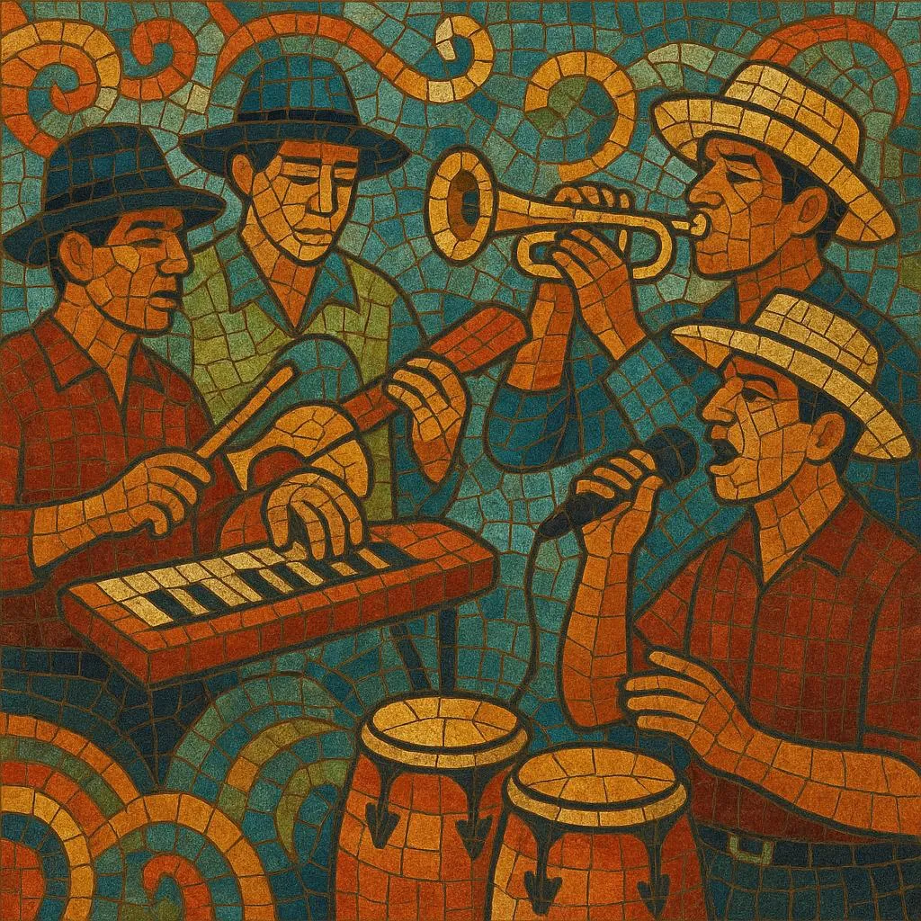 It carries the Colombian cumbia beat into a northern-Mexican party context: bright lead keyboards and synth-brass double with sax or trumpet lines; electric bass lays a tumbao against güiro, congas, timbales and drum‑kit backbeats; and singers trade coros and shout‑outs celebrating barrio identity, romance and the dance floor. The result is a high-energy, dance-forward sound closely tied to local bands and weekend bailes.