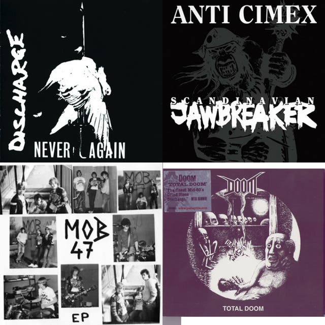 D-beat emerged in the United Kingdom in the early 1980s, crystallizing around Discharge’s stark, anti-war hardcore. Their propulsive drum pattern—fast, straight 8ths with an alternating kick–snare drive—became the genre’s signature. Early peers and fellow travelers in the UK82 and anarcho-punk milieu, such as The Varukers and Doom, reinforced the template: brutal minimalism, relentless rhythm, and bleak socio-political messaging.