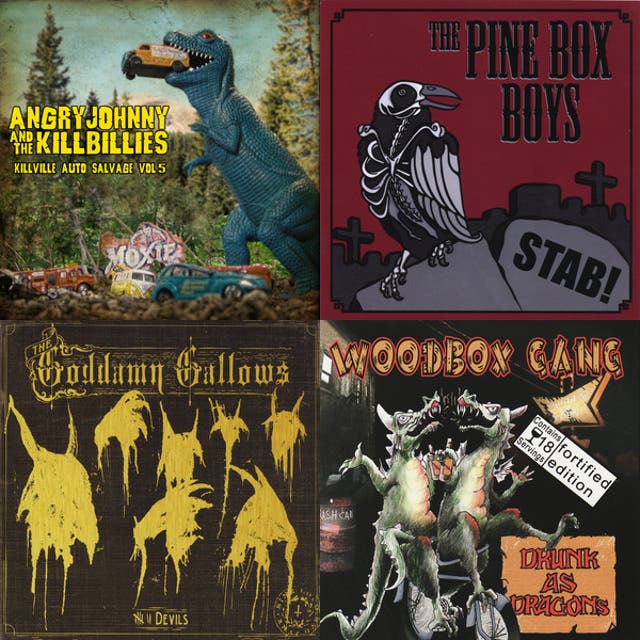 Instead of high-gain electric guitars, it foregrounds banjo, mandolin, fiddle, acoustic guitar, and upright bass—often reinforced by a drum kit or heavy percussion—while incorporating tremolo-picked lines, chromatic movement, minor-mode harmony, and harsh growled or screamed vocals. Tempos tend to be fast, the playing is virtuosic, and the lyrics lean toward macabre folklore, frontier fatalism, and dark-humored storytelling.