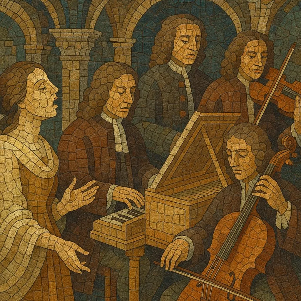 Typical sound worlds range from intricate a cappella choral counterpoint to richly ornamented solo/ensemble music with harpsichord and continuo bass, and from courtly dance suites to large-scale sacred works and early opera.