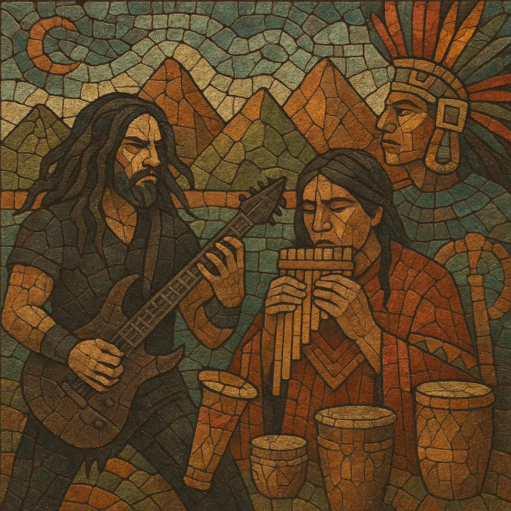 It commonly blends distorted guitars, double‑kick drumming, and harsh or powerful clean vocals with acoustic timbres such as charango, quena and siku (Andean flutes/panpipes), bombo legüero, ocarinas, and Indigenous drums like huéhuetl or teponaztli. Melodic materials often draw on pentatonic or Aeolian/Dorian scales and on motifs from huayno, carnavalito, cueca, saya, chacarera, and other regional dances, while lyrics explore pre‑Columbian mythologies (Inca, Mexica/Aztec, Maya, Mapuche, etc.), nature and mountainscapes, historical memory, and anti‑colonial/identity themes.