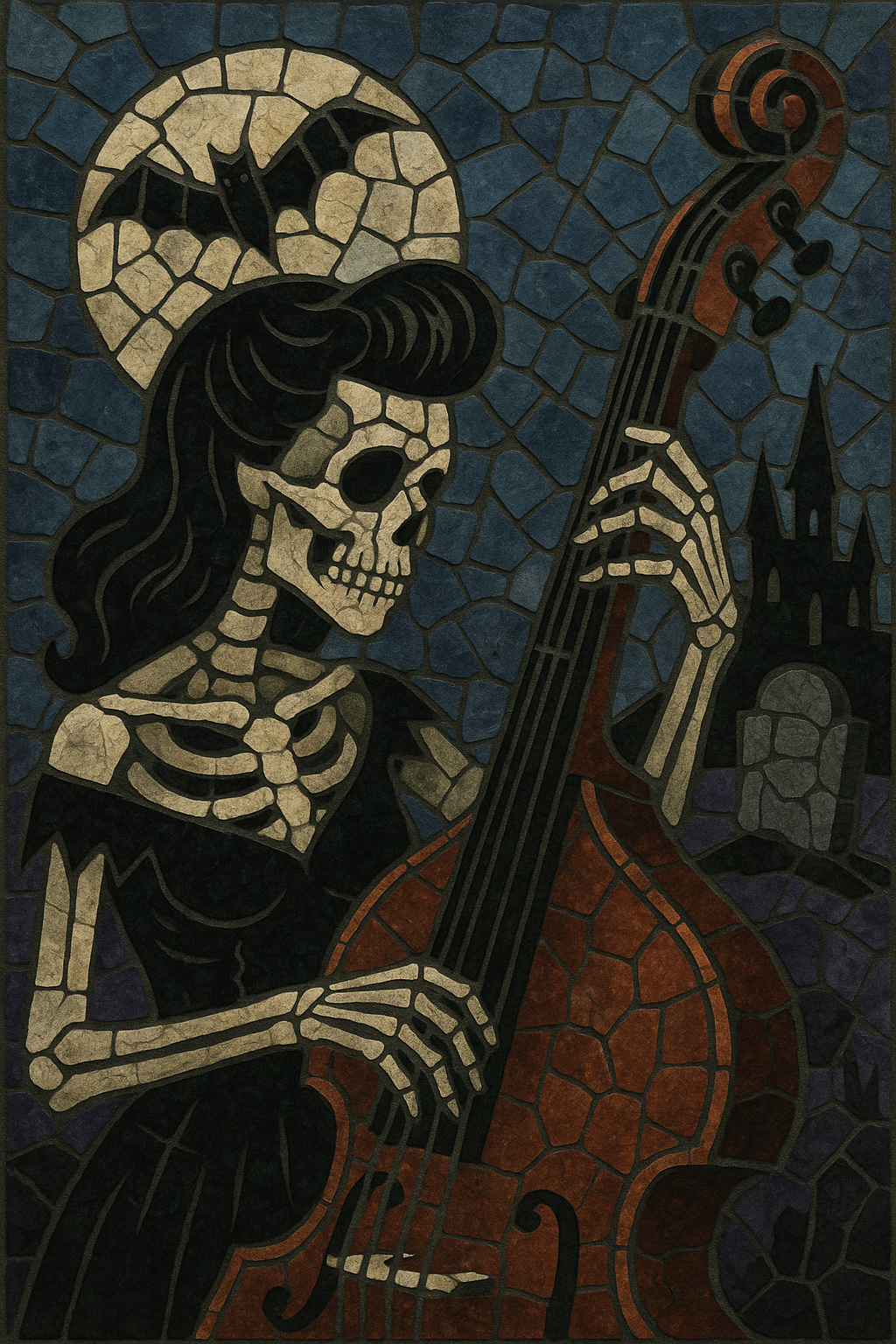 Musically, gothabilly balances minor‑key progressions and chromatic riffs against classic rock ’n’ roll forms, often adding reverb‑drenched tremolo picking, haunted organ or theremin flourishes, and a theatrical, midnight‑movie vibe.