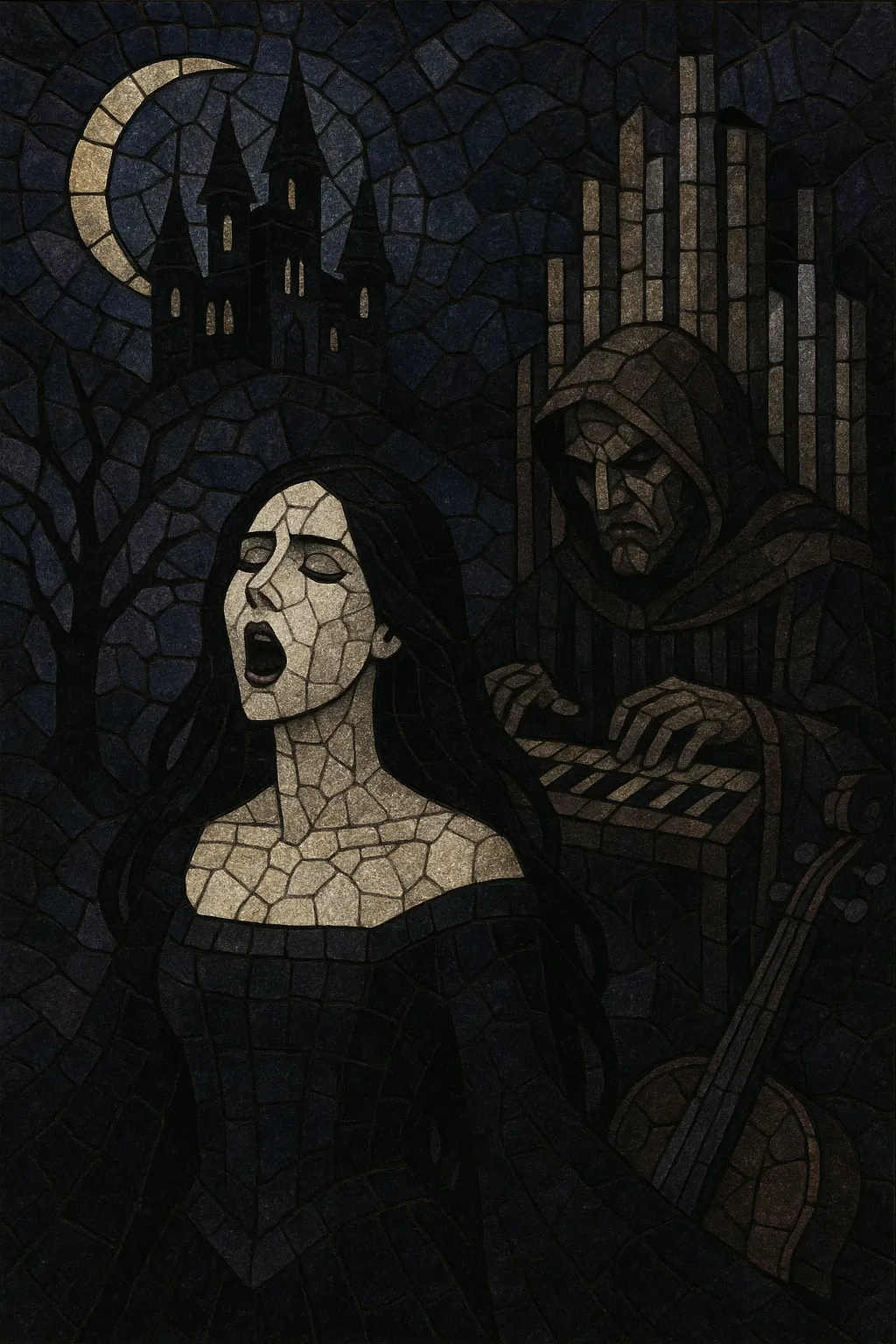 The harmony favors minor keys, modal colors (Aeolian, Phrygian), and chromatic lines, while the arrangements borrow from classical and operatic writing: overture‑like intros, leitmotifs, and dynamic crescendos. Lyrically, it leans toward myth, fantasy, romance, spirituality, melancholy, and gothic literature, delivered with a dramatic, theatrical sensibility.