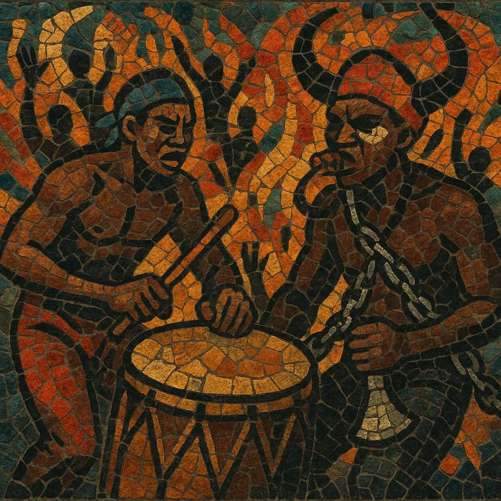 Compared with mainstream Trinidadian soca, it leans darker and rougher: booming bass drums, iron (brake‑drum) percussion, whistles, cowbells, conch‑shell calls, and chant‑like hooks drive the groove. Songs often use minor keys, sparse melodies, and call‑and‑response crowd parts that evoke the ritual intensity of Jab Jab—oil, mud, chains, and predawn mas.