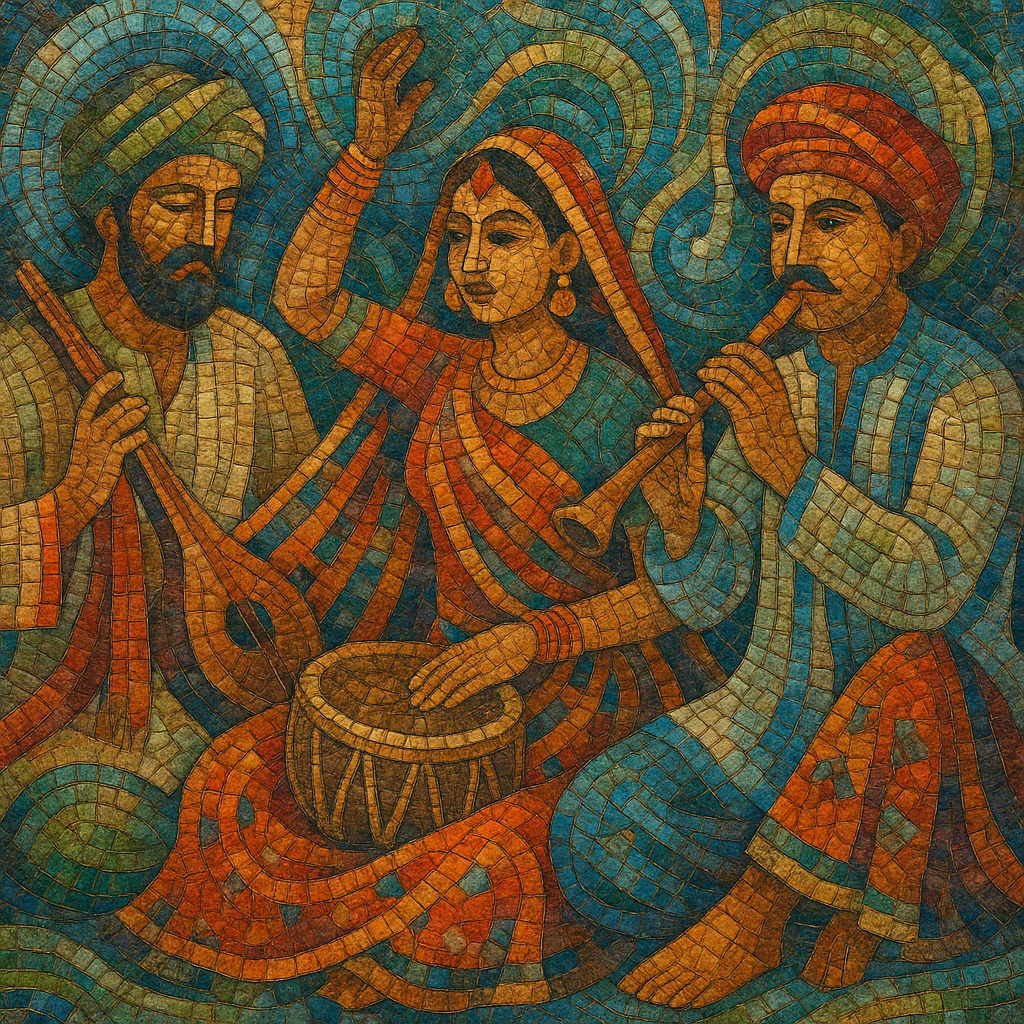 Gujarati folk music is the traditional music of Gujarat, a western Indian state whose coastal trade routes and devotional movements shaped a distinctive sound. It spans lively communal dance songs such as garba and dandiya raas, narrative dayro storytelling, temple and household bhajans, Sufi-influenced pieces in certain communities, and songs embedded in folk theatre like Bhavai.