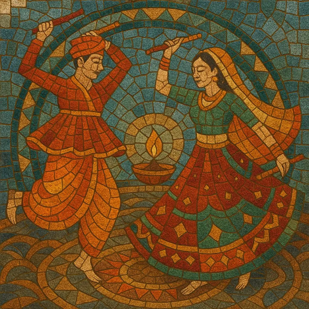 Garba takes its name from "garbha" (womb/lamp), referencing the lamp placed at the center of a dancing circle that symbolizes the creative energy of the Goddess. The tradition crystallized in Gujarat as a devotional community practice tied to Navratri (the nine nights of Goddess worship), with songs invoking Amba/Durga and celebrating agrarian cycles. Early performances were acoustic and intimate—voice, claps, and drums—facilitating long, trance-like rounds of circular dance.