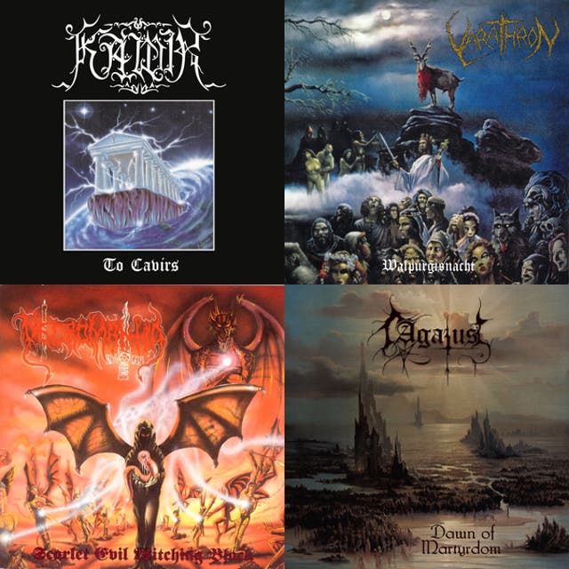 The genre crystallized with landmark albums: Rotting Christ’s "Thy Mighty Contract" (1993), Varathron’s "His Majesty at the Swamp" (1993), and Necromantia’s "Crossing the Fiery Path" (1993) and "Scarlet Evil Witching Black" (1995). Thou Art Lord, Zemial, Kawir, and Agatus expanded the palette—Kawir in particular foregrounded pagan/Hellenic heritage—while Necromantia’s dual‑bass, no‑rhythm‑guitar configuration became iconic. International labels helped export the sound, establishing “Hellenic black metal” as a recognized school.