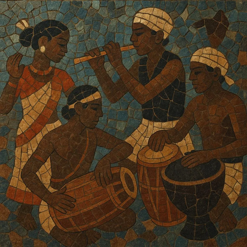 The sound world is drum-led—especially mandar and tamak (barrel and kettle drums)—reinforced by nagara, idiophones (clappers, rattles), and aerophones such as bamboo flutes and the reedy mahuri. Melodies are modal and pentatonic-leaning, lyrics are concise and image-rich, and the groove stresses propulsive, danceable ostinati that can shift with choreographic figures.