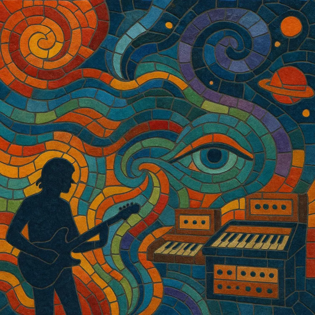 Expect saturated guitars (fuzz, phaser, tremolo), tape-like delays, spring reverbs, vintage keyboards (Mellotron, organs, analog synths), and cyclical grooves that favor trance over virtuosity. Songs often balance hooky, indie-style choruses with expansive instrumental passages, drones, or motorik pulses.