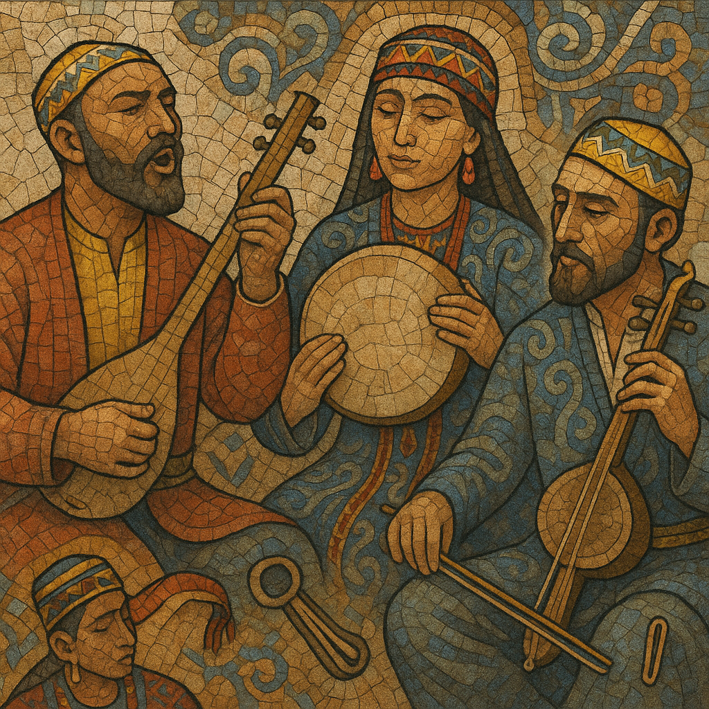 It blends epic recitation (zhyrau/bakhshi) with lyrical songs, dance pieces, and instrumental kúy, performed on regional instruments such as the dutar (two‑string long‑necked lute), gijjak (bowed spike fiddle), qobyz (bowed lyre), doira (frame drum), and jaw harp. Melodically it alternates between pentatonic and heptatonic modal thinking and draws on Islamic/maqām-related melodic sensibilities, while rhythm ranges from free, speech‑like declamation in epics to lively duple or compound meters for dance.