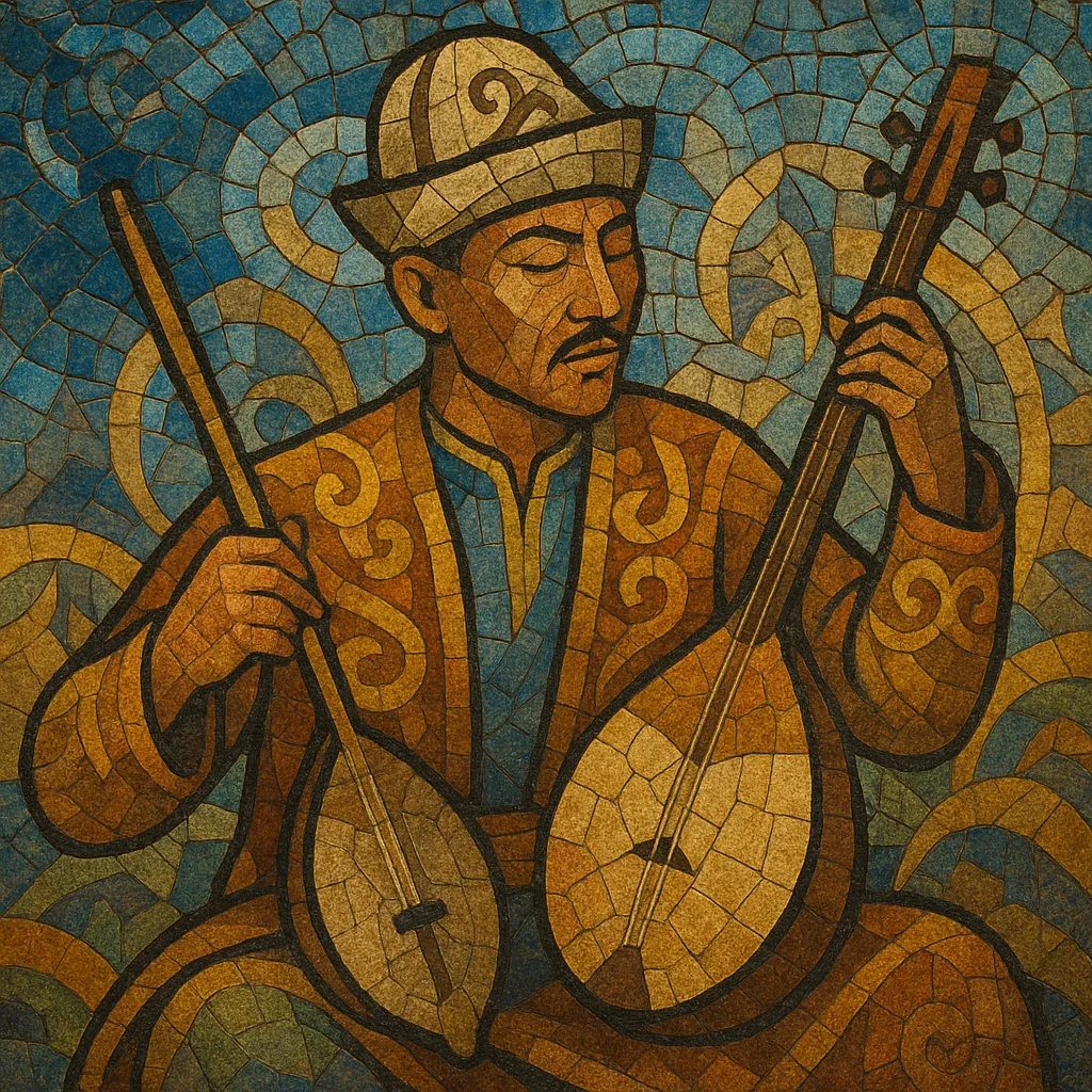 It is rooted in a nomadic, oral tradition centered on the solo instrumental art of the küy (programmatic pieces) for the two‑string dombyra and the bowed qyl‑kobyz, as well as epic singing (zhyr/zhyrau) and improvised song duels (aytys) by akyn poet‑singers.