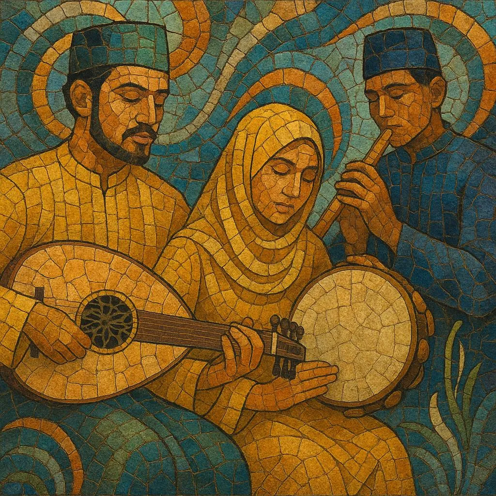 Musically, it favors lyrical, ornamented melodies (often melismatic), gently pulsing dance rhythms inherited from court and folk repertoires, and simple, song-centered harmony. Typical textures mix traditional timbres (gambus/oud, rebana frame drums, seruling flute, violin) with guitars, keyboards, and light drum-set grooves. Lyrically, Lagu Melayu leans toward pantun-style poetry, romance, nostalgia, morality, and spiritual themes.