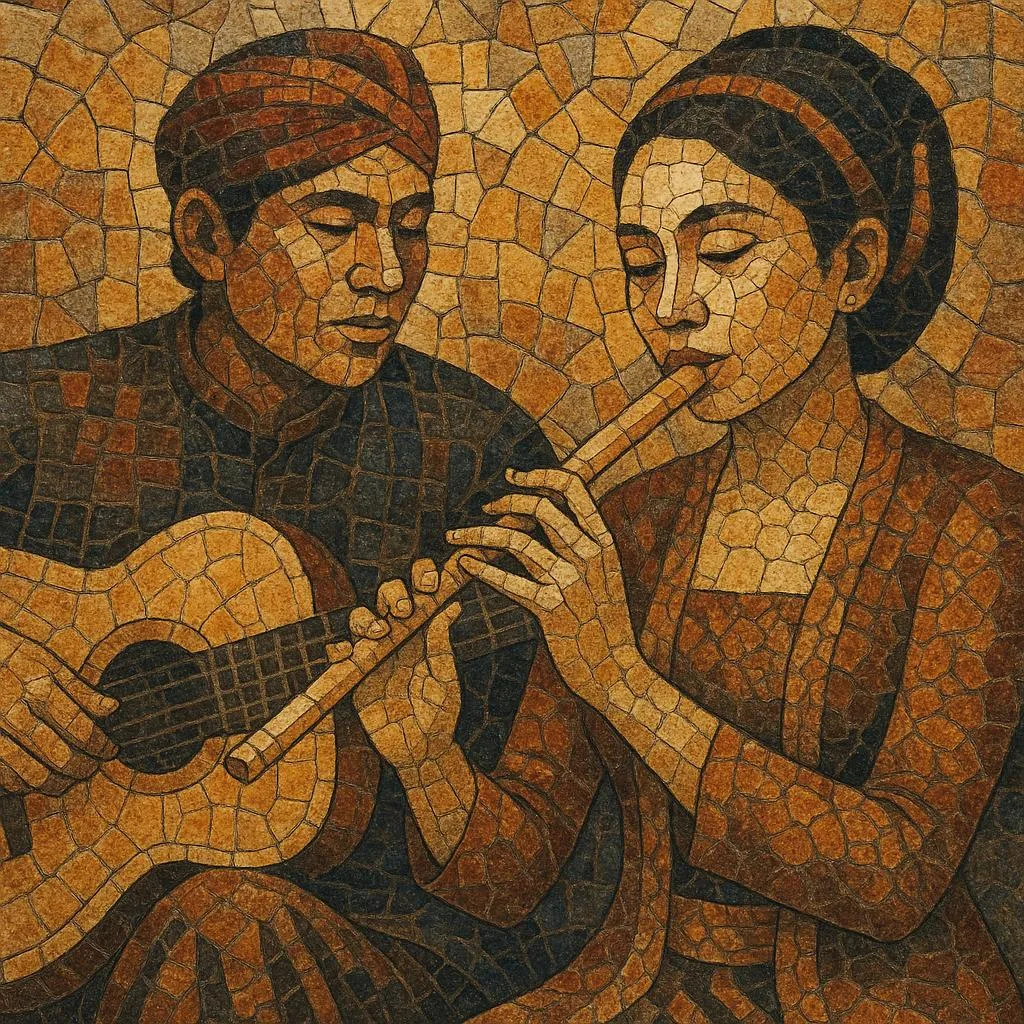 Classic tarling is built around a small ensemble: lead vocal (often in Cirebonese dialect), guitar providing both rhythm and melodic fills, suling carrying lyrical, gamelan-inspired ornamentation, and local percussion (kendang/kecrek) driving danceable, mid-tempo grooves. Melodically it leans on pelog/slendro inflections translated to diatonic instruments, with expressive bends and cengkok (melodic turns). Lyrically, songs range from romance and everyday life to humorous and moral tales tied to village festivities and coastal markets.