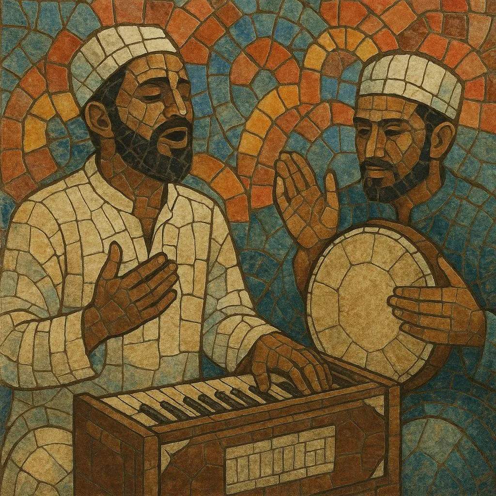 Musically, Mappila songs blend Arabic/Persian melodic color (notably maqam-like inflections such as Hijaz and Bayati with their characteristic augmented seconds) with South Indian (Carnatic) ornamentation and local folk rhythms. The vocal style favors melismatic lines, free ornamental turns, and call-and-response performance. Core accompaniment historically centers on frame-drums (duff/daff) and hand-clapping, with harmonium and tabla entering modern practice. Lyrics were long written in Arabi-Malayalam (Malayalam written in Arabic script), underscoring the genre’s historic Arab–Malayali cultural interface.
