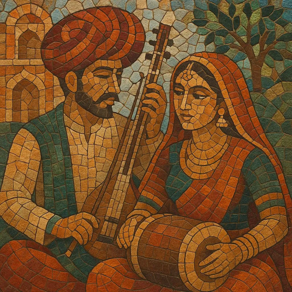 Songs are typically love duets, wedding and festival numbers, playful teasing exchanges, or pride-in-community pieces that reference local places, clan names, and everyday life. Instrumentation spans harmonium, dholak, khartal, manjira, sarangi, and morchang, alongside keyboards, programmed drums, and Auto‑Tune. Rhythms most often sit in 4/4 with Hindustani folk talas such as keherwa (8‑beat) and dadra (6‑beat), while melodies lean on raga‑tinged folk modes (often Khamaj/Mixolydian or Pahadi) and a drone‑centered tonal feel.