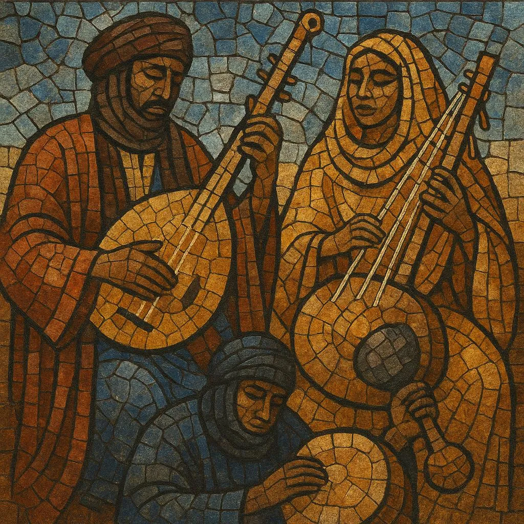 Its core sound centers on the men’s four‑string lute tidinit and the women’s angled harp ardin, with percussion from the tbal kettledrum (and rattles like the daghumma). Repertoire is organized by three “ways” (al‑bayḍa ‘white’, al‑kahlā ‘black’, l‑gnaydiya ‘spotted’) and proceeds through five modal stages (karr, fāgu, lakhal, labyad, lebtyāt), a learned system linking musical color to emotion and life‑cycle symbolism. Since the late 20th century, amplified guitar has frequently shadowed or replaced the tidinit, while the poetic, melismatic vocal style in Ḥassāniyya Arabic remains central.