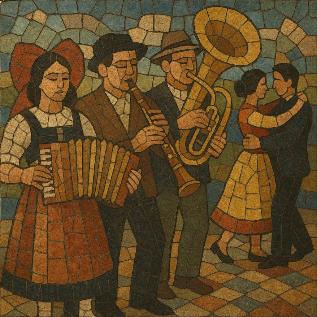 Typical textures come from fanfares/harmonies (community wind bands), small dance ensembles with accordion, clarinet, fiddle, and brass rhythm (oom‑pah bass with off‑beat chords), and male or mixed choirs. Songs are frequently performed in Alsatian (an Alemannic German dialect) as well as in French, celebrating wine-making, village life, carnival, and local humor. Dance forms such as waltz (3/4), polka (2/4), schottische, and marches underpin much of the repertoire.