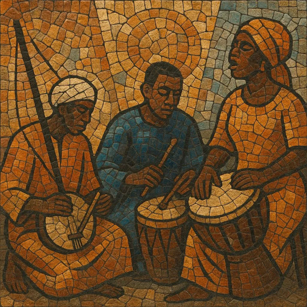 Historically, the idiom coalesced around the xalam/hoddu (a skin‑topped lute with 2–5 strings), balafon with gourd resonators, calabash percussion, talking drum (tamani), dundun bass drum, and the metallic karinyan scraper. Lead singers deliver melismatic lines over repeating instrumental ostinati, answered by a chorus; timelines and interlocking drum parts create a gently propulsive 12/8 or 4/4 feel suited to dance and processional use.