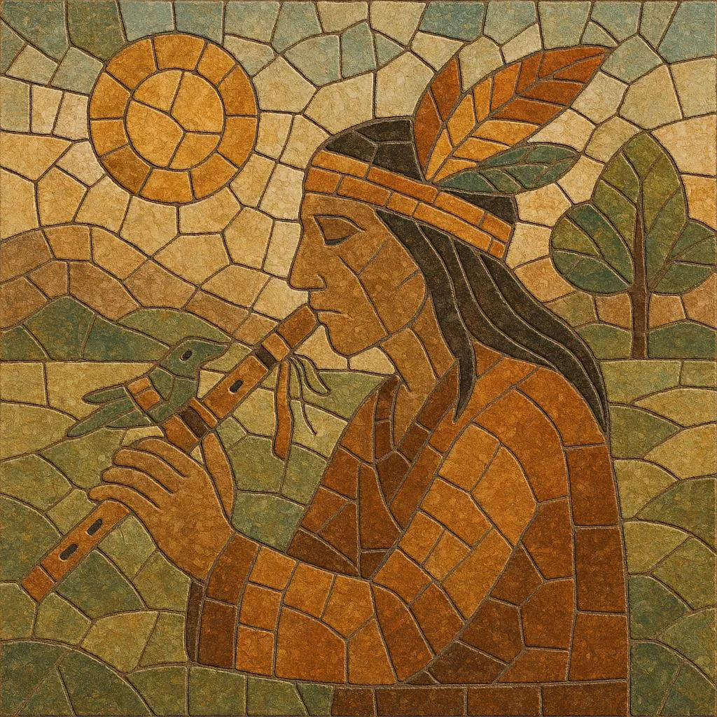 Native American flute music centers on the distinctive end-blown, two-chambered wooden flute found historically across many Indigenous nations of North America—especially the Plains and Woodlands. The instrument’s external block (or "bird") creates a mellow, breathy tone, and its most common tuning supports a minor pentatonic scale that lends a contemplative, intimate sound.