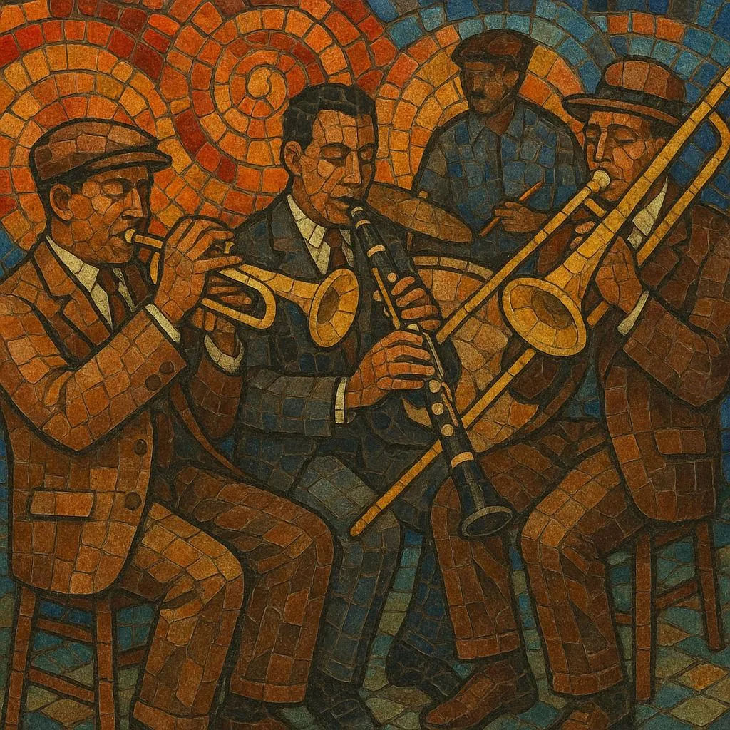 New Orleans jazz grew out of the city’s brass band culture, parade music, ragtime syncopation, the blues, and dance music heard in neighborhoods, social clubs, and venues such as Storyville.
