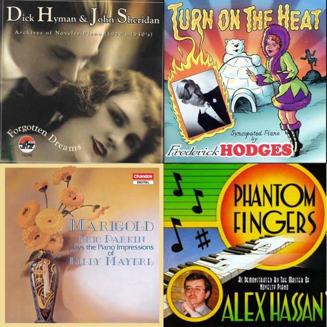 Novelty piano is a virtuosic, light-classical offshoot of ragtime that blossomed in the 1920s United States, particularly around Chicago’s player‑piano industry. It favors clean, showy right‑hand figurations (rapid runs, black‑key cascades, chromatic turns) over heavy syncopation, and often presents a bright, tuneful melody over a tidy, lightly striding or oom‑pah left hand.