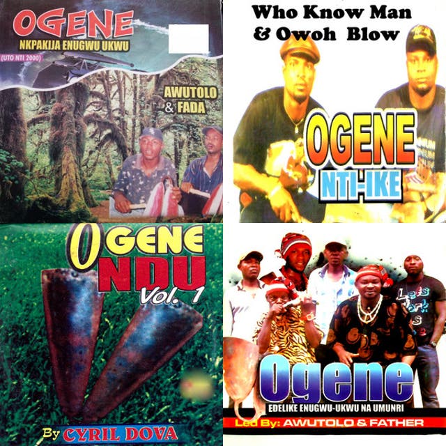 Ogene music is a traditional ensemble style of the Igbo people of southeastern Nigeria built around the ogene, a large forged iron bell that serves as the timekeeper and lead voice. The ensemble typically combines multiple ogene bells with slit drums (ekwe), clay pot drums (udu), wooden clappers (okpokolo), shakers (ichaka), and vigorous call-and-response singing.