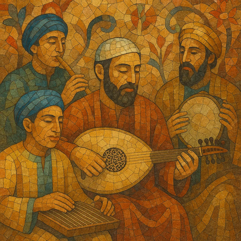 It blends Hebrew and Judeo-Arabic (and occasionally Ladino) texts with maqām-based melody, microtonal inflection, and cyclical iqa'at (Arabic/Turkish rhythms). Typical textures are heterophonic—voices and instruments ornamenting the same line rather than using dense harmony. Core instruments include oud, qanun, violin, ney, and frame/hand drums such as darbuka and riq; in modern settings, keyboards with quarter-tone capability and guitars may appear.