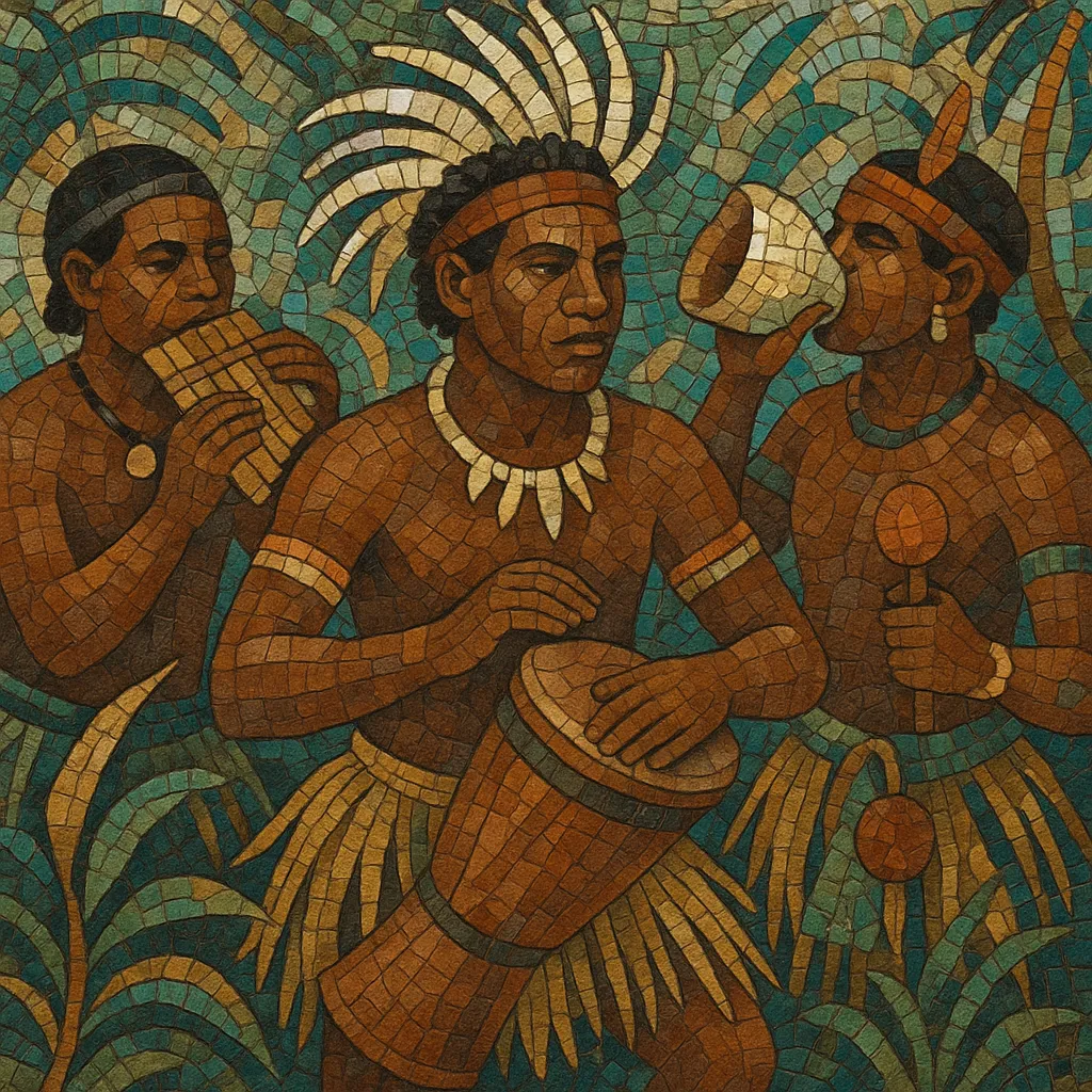 Core soundworlds include the deep pulse of kundu/tifa hand drums and garamut slit drums, bright bamboo flutes and panpipes, resonant conch shells, rattles and seed shakers, and the susap (mouth harp), often used in courtship. Vocals are central: unison or tightly interlocking group singing, call-and-response, vocables, and heterophony are common, with scales ranging from pentatonic and anhemitonic to locally specific tunings and microtonal inflections.