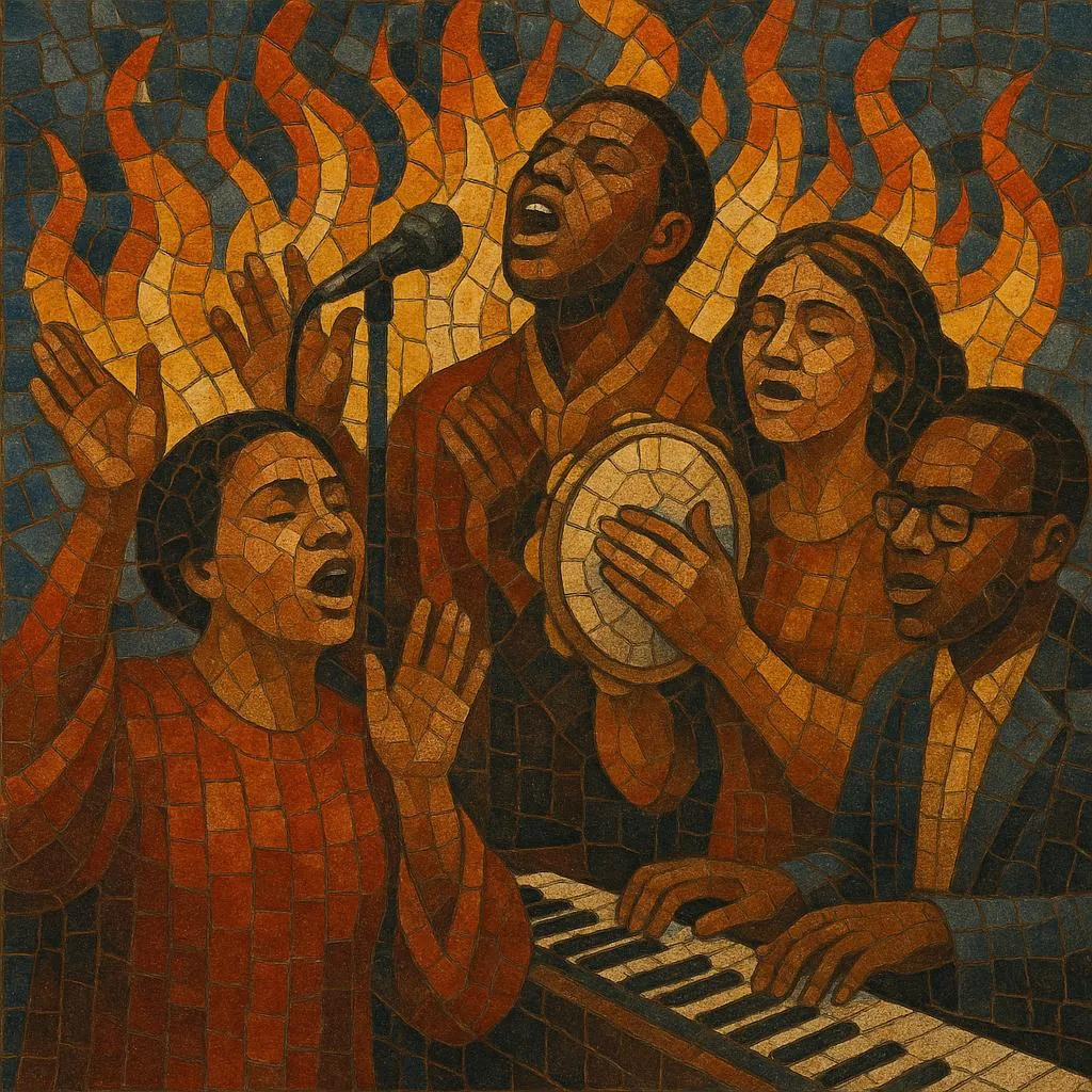 Musically, it blends African American spirituals and blues with hymnody and early gospel, later absorbing contemporary pop/rock, R&B, and global local styles. Typical sounds include piano or Hammond B‑3 organ with Leslie speaker, full rhythm section, mass choir, and vamping grooves that build to "shouts" (fast praise breaks). Lyrics focus on salvation, deliverance, healing, holiness, and the empowering presence of the Spirit.