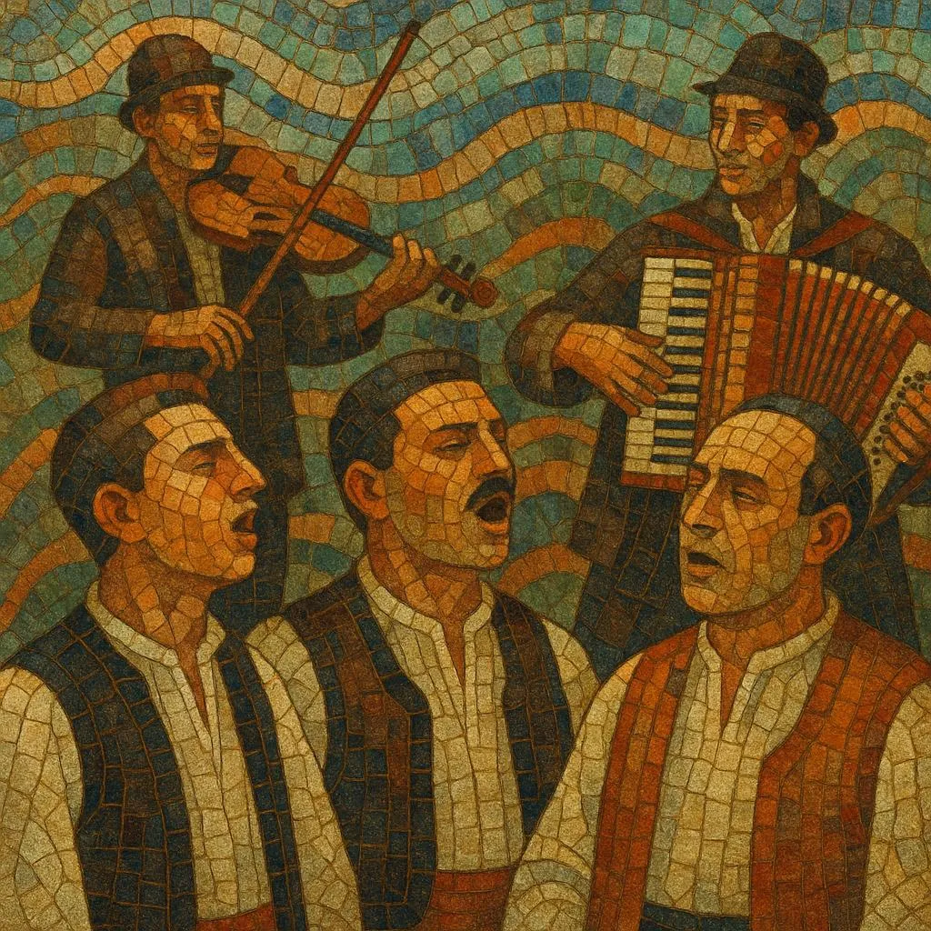 The style ranges from powerful, chest‑voiced, rugged Lab ensembles to more lyrical Tosk variants, and it also includes southern urban "qytetare" songs (serenata) and dance tunes accompanied by clarinet, violin, laouto/lute, accordion, and frame drum. Modal melodies, narrow ambitus lines, ornamented phrases, and free or asymmetrical meters (2/4, 7/8, 9/8, 12/8) are common. Themes move between love, pastoral life, migration and exile, heroic memory, and communal ritual—performed at weddings, seasonal feasts, and regional festivals.