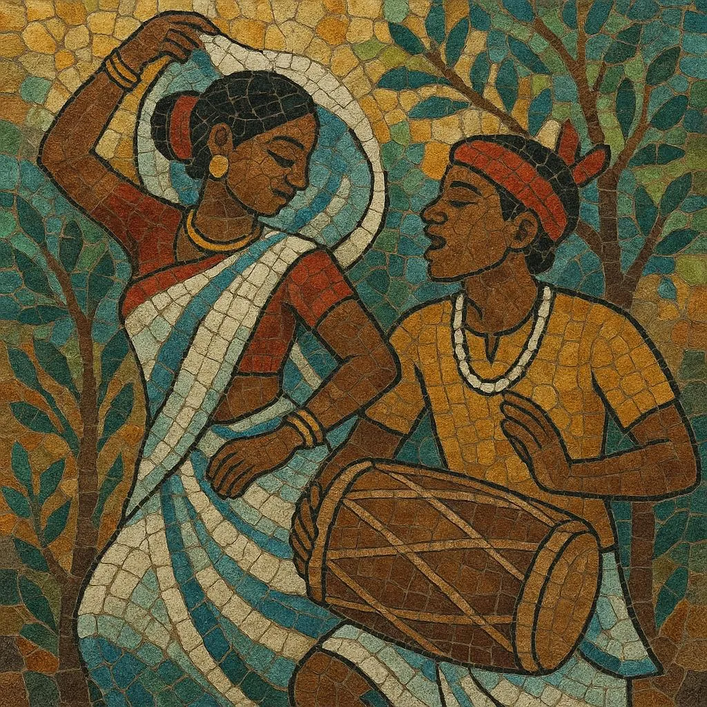 Santali popular song culture grew out of a long tradition of Santal festival singing and ensemble dance, accompanied by drums such as the tumdak' and tamak'. In the late cassette era, regional studios in Jharkhand, Odisha, and West Bengal began recording Santali‑language songs with pop arrangements. Cheap cassettes and community radio helped these songs circulate beyond live festivities into everyday listening.