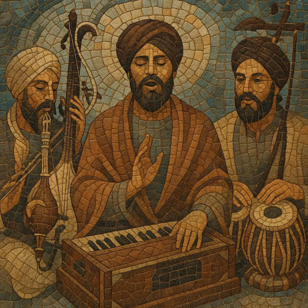 Sikh shabad practice begins with Guru Nanak (1469–1539), who traveled with the rabab player Bhai Mardana, singing revelatory hymns within ragas familiar to North Indian art-music culture. Successive Gurus formalized performance as congregational kirtan. In 1604, Guru Arjan compiled the Ādi Granth (later Guru Granth Sahib), explicitly organizing hymns under raga headings and, in places, indicating rhythmic/structural cues (ghar), anchoring a uniquely scriptural musicology.