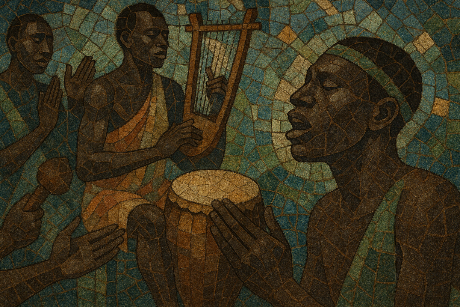 The music has long been transmitted orally by praise leaders, ritual specialists, and village ensembles. Call‑and‑response singing, ululation, and interlocking drum ostinati define the ensemble sound, often in a lilting triple feel (6/8) with cross‑rhythmic clapping. Melodic ranges are moderate and iterative, supporting narrative texts; scales are typically pentatonic or tetratonic, with pitch inflections shaped by vocal delivery rather than fixed temperament.