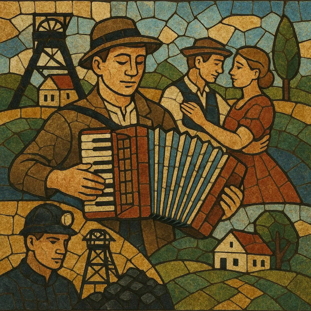 Slaskie piosenki (Silesian songs), often referred to as 'śląskie szlagiery' (Silesian schlagers), is a popular music genre from the Upper Silesia region of Poland. It blends traditional Silesian folk music with German Schlager, polka, and pop elements. The lyrics are almost exclusively sung in the Silesian dialect (godka) and focus on themes of regional identity, family life, coal mining traditions, love, and the joys of everyday life. The music is characterized by simple, catchy melodies, a strong rhythmic pulse suitable for dancing (often 2/4 or 3/4 time), and instrumentation that frequently includes accordions, brass sections (or synthesizers mimicking them), and guitars.