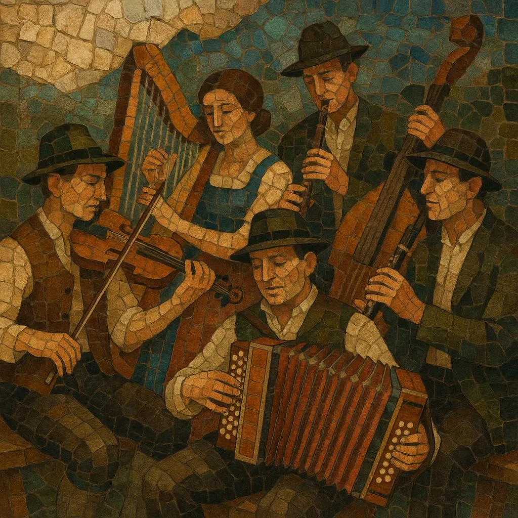 Typical ensembles blend strings and plucked instruments (fiddle, zither, harp, guitar, double bass) with the Steirische Harmonika (diatonic button accordion), clarinet, and sometimes brass or a hammered dulcimer (Hackbrett). The style favors clear melodies, buoyant rhythms, uncomplicated diatonic harmonies, and a lively, earthy sound designed to keep dancers moving. While closely related to "Stubenmusi" (intimate parlor folk for listening), Tanzlmusi remains first and foremost dance music—social, local, and highly groove‑conscious.
