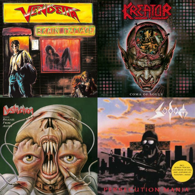 Teutonic thrash metal is the German branch of 1980s thrash known for its raw aggression, grim atmosphere, and razor‑edged precision. Compared to the Bay Area’s more technical or melodic variants, it favors harsher vocal deliveries, darker harmonies, and a relentless, martial drive.
