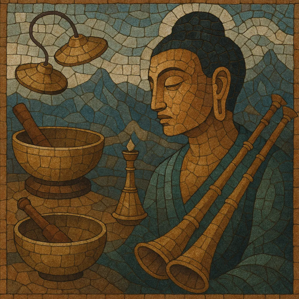 Tibetan new age is a contemplative substyle of New Age that blends Tibetan Buddhist chant, ritual instruments (singing bowls, tingsha, dungchen long horns, gyaling oboes), and Himalayan modal idioms with spacious ambient production.