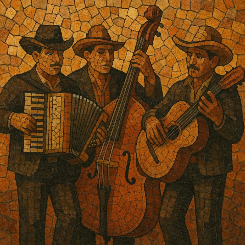 Typically heard in early norteño/campirano trios and quartets, the ensemble pairs accordion and bajo sexto with the tololoche, and sometimes a light snare (tarola). Repertoires center on polkas (2/4), waltzes (3/4), rancheras, and corridos, with brisk dance tempos and narrative lyrics about rural life, romance, travel, and bravado.