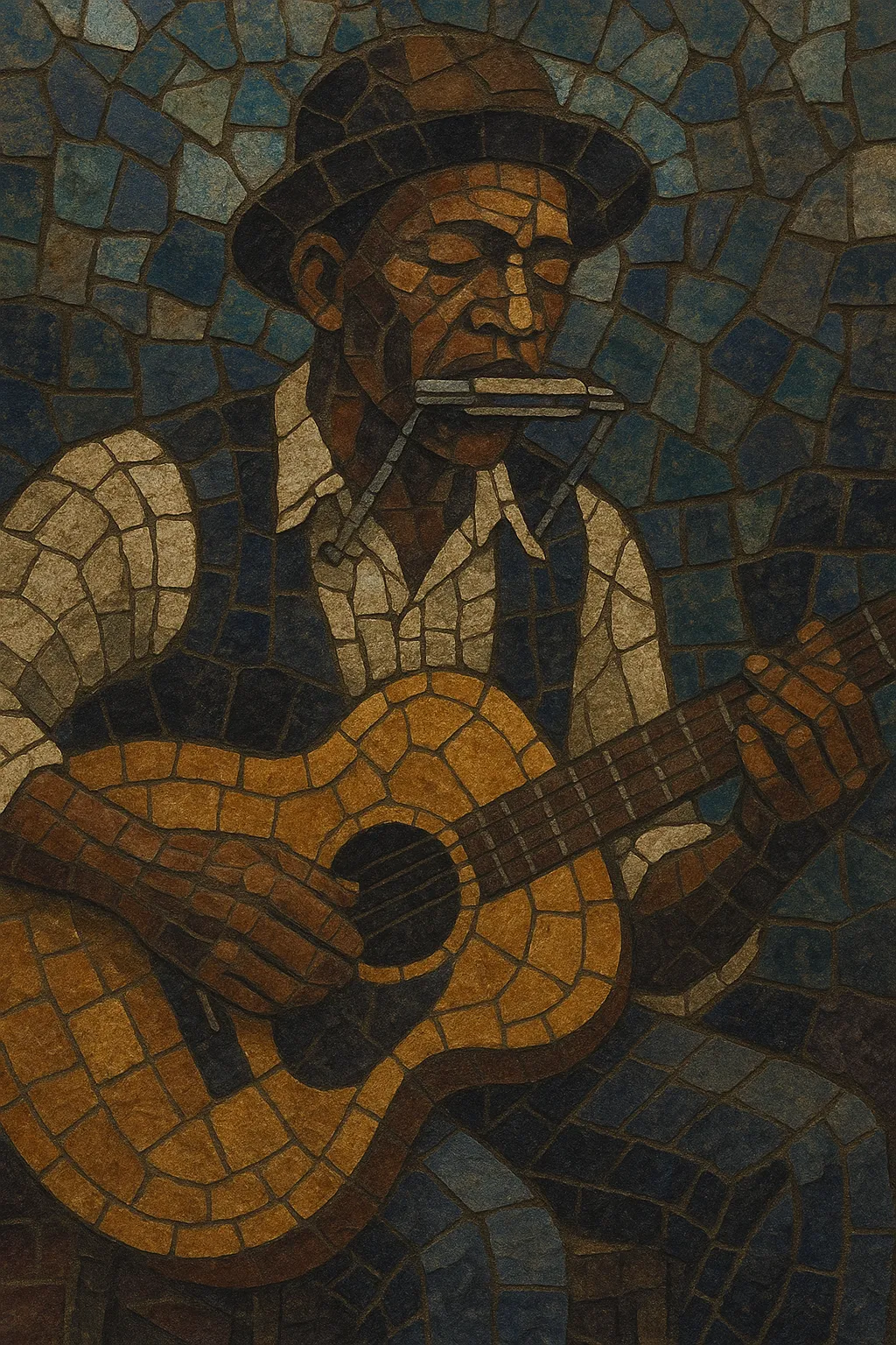 It blends African-derived vocal practices (call-and-response, blue notes, melisma) with work songs, field hollers, spirituals, and ring shouts, coalescing into personal, narrative songs accompanied by guitar, voice, and sometimes harmonica.