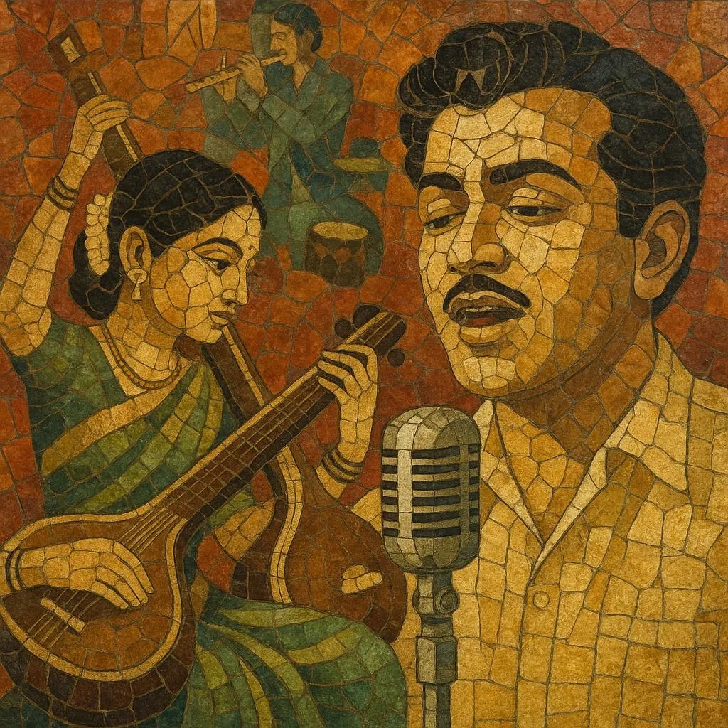 The style is defined by memorable, classically inflected tunes (often in Carnatic ragas), the pallavi–anupallavi–charanam song architecture, and lush arrangements that place Indian instruments (veena, flute, mridangam, tabla) alongside Western strings, brass, guitar, accordion, and early electric keyboards. Playback singing matured here, with legendary voices shaping the emotive core of mythologicals, historicals, and social dramas.