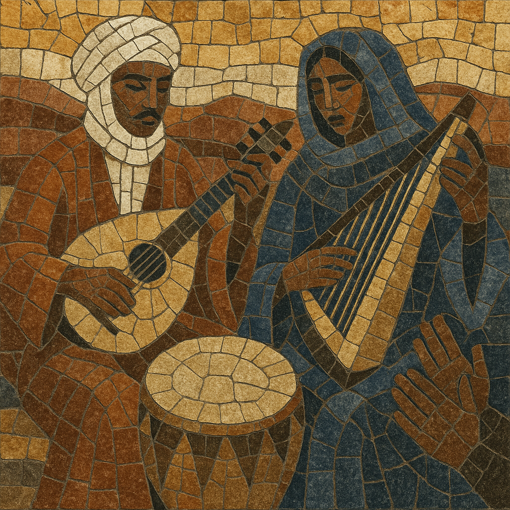 Western Saharan folk emerges from the Sahrawi haul tradition shared with Moorish musical cultures of the southwest Sahara. For centuries, poets and musician lineages sustained a modal, largely oral practice centered on the tidinit lute (men) and the ardin harp (women), complemented by tbal drum, handclaps, and responsorial singing. This repertoire mingled praise poetry, love songs, genealogies, and communal celebration, all articulated in Hassaniya Arabic and shaped by broader Arabic and Maghrebi modal aesthetics.